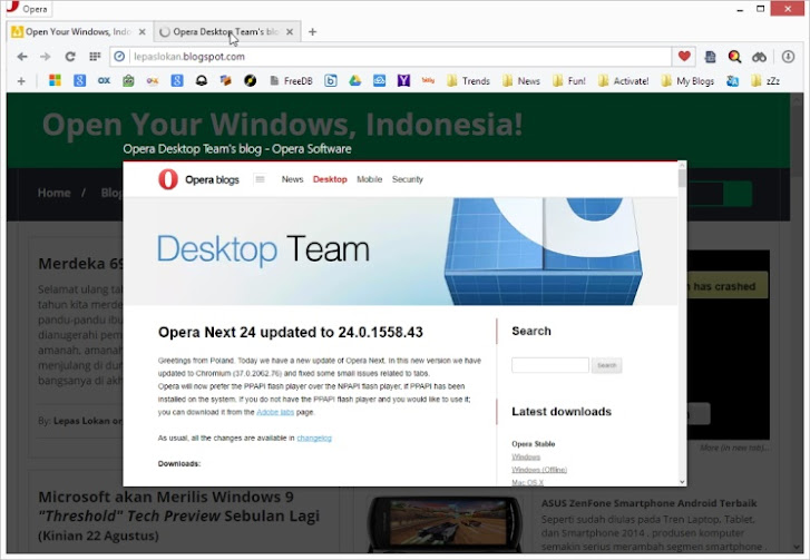 Opera sejak awal 2013 beralih dari render engine Presto ke Webkit kemudian Blink—pokoknya mengikuti Chrome. Hasilnya, kini Opera memang secepat Chrome tapi dengan fitur tampilan yang berbeda—dan menurut saya manis.Saya suka versi Dev-nya yang sudah dilengkapi fitur-fitur baru seperti bookmarks atau tab preview, yakni bisa mempratinjau isi tab lain,